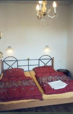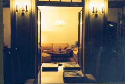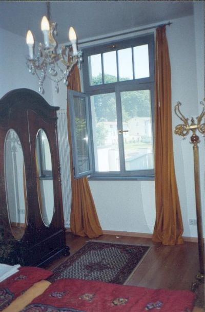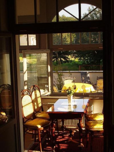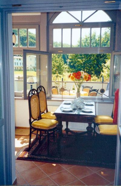 Ausblick beim Frühstück aus Veranda auf Wiesengrund am Waldrand, nach links 220 m zum Strand