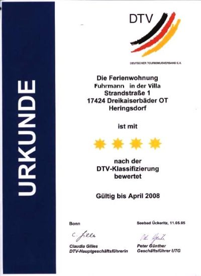 Die am 29.04.2005 durchgeführte Prüfung erfasste 142 europaweit einheitlich vorgegebene Kriterien. Wir erhielten 817 von 899 möglichen Punkten. Zum 5-Sterne-Prädikat fehlte uns im wesentlichen ein Golfplatz und ein Hausdiener auf Knopfdruck.