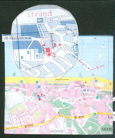 500m geradeaus bis bergauf ein Durchfahrtverbotsschild linksabbiegen erzwingt. 50 m zur Strandstraße.Auf dieser rechts, nach 30 m links in "Maxim-Gorki-Strasse" abbiegen und sofort wieder links in Einbahnstrasse, in die "Labahntrasse" einmünden. Hier nach 30 m auf der linken Strassenseite Nr. 1c Schiebetoreinfahrt auf das Grundstück.Schiebetor mit Wohnungsschlüssel öffnen. Erster Stellplatz rechts (01). Dahinter kleine historische Villa; auf Fußweg links daran vorbei gehen; Wohnungstür (Strandstr. 1 = postalisch Labahnstraße 3c. WE 01, part) an Veranda zur Strandstrasse hin orientiert. Innen neben Eingang rechts mit Plastekarte in Wandkästchen einschieben zwecks Elektro-Freischaltung (Kühlschrank bleibt aber an)